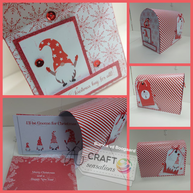 Ook de laatste challenges zijn deze maand ingegaan, voor de kerstchallenge heb ik een soort van Brievenbus gemaakt, leuk om je kerst kaarten in te bewaren. Ik heb het nieuwe blok "I'll be Gnome for Christmas" gebruikt, meer heb je eigenlijk niet echt nodig... Bakerstwine en pailletjes heb ik ook gebruikt gewoon omdat ik dat leuk vind.