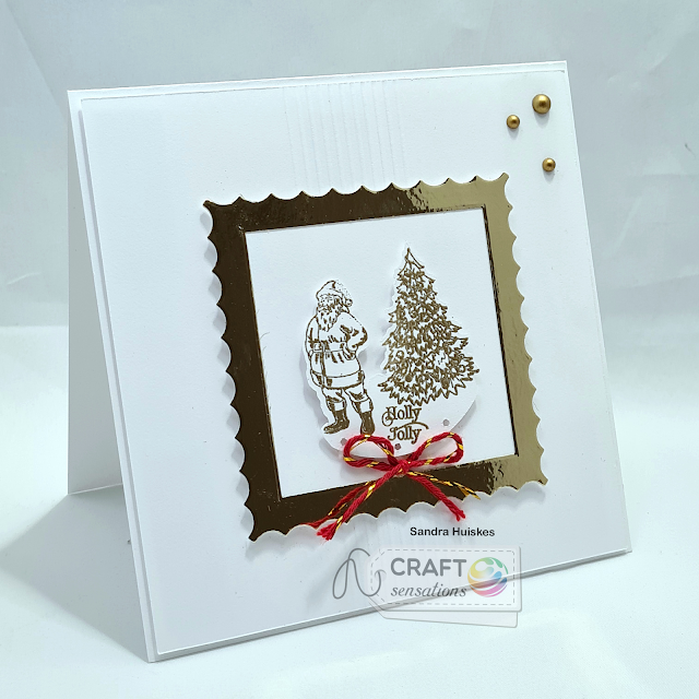 De afbeelding met de kerstman en kerstboom heeft eigenlijk nog een soort kerstbal boven de kerstman hangen. Omdat ik niet zo zuiver gestempeld had, kwam die kerstbal niet mooi over. Daarom besloot ik om dat deel van het ornament weg te knippen en de afbeelding vervolgens te plaatsen in een vierkant sierframe. Ook weer bekleed met metallic sheets.